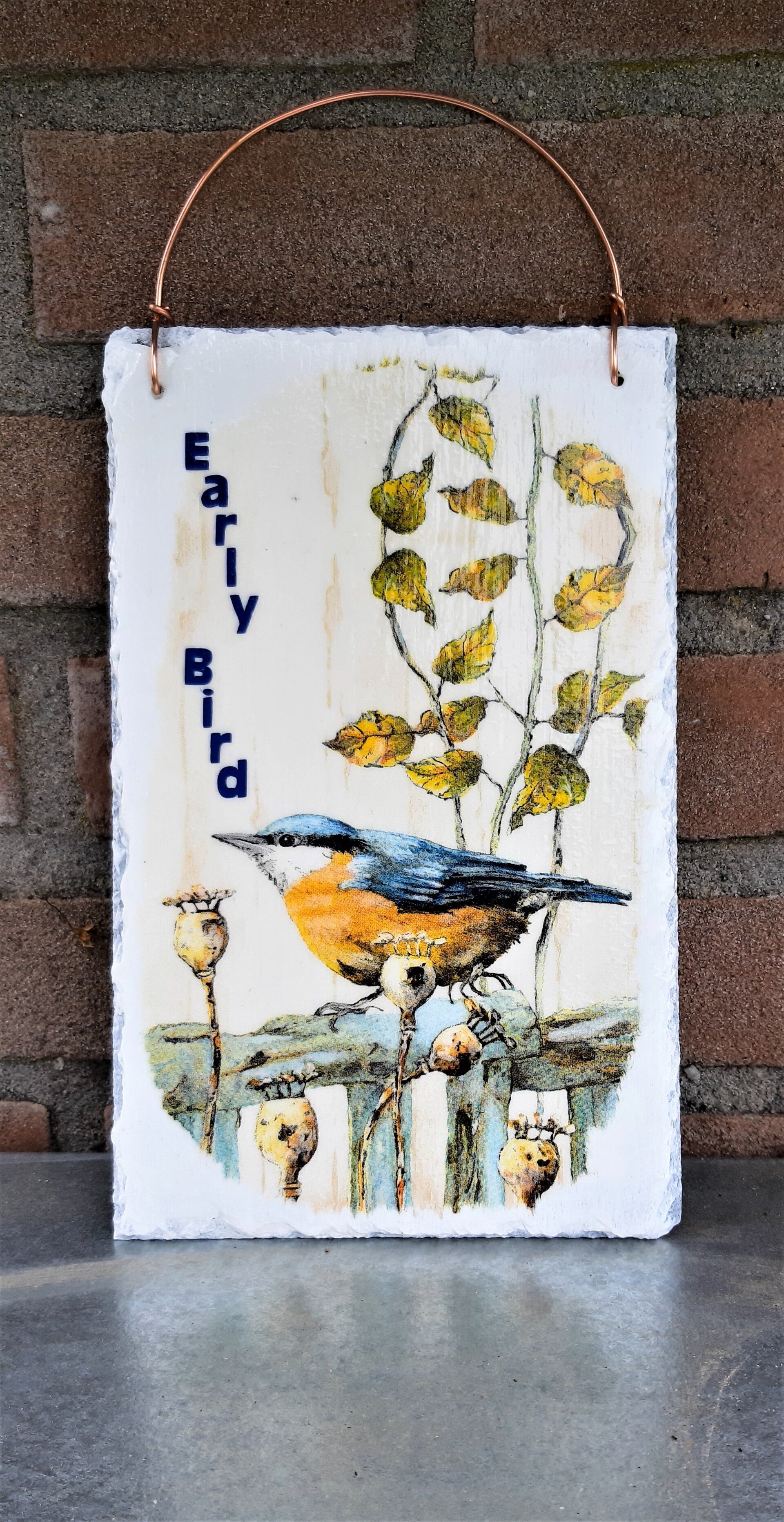 Dit charmante vogeltje is geplaatst op een stuk leisteen van 20 x 14,5 cm en is vijf keer gelakt.