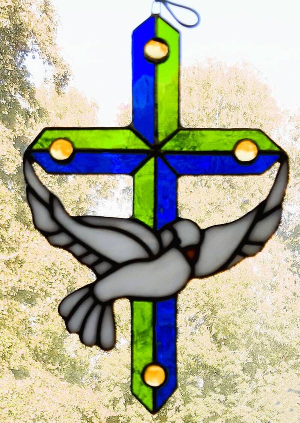 Prachtig glaswerk in de stijl van Tiffany. Het kruis is vervaardigd uit groen en blauw glas, verrijkt met vier gele glasnuggets (eigenhandig gefused) in de uiteinden, terwijl het soldeerwerk zilverkleurig is gehouden.