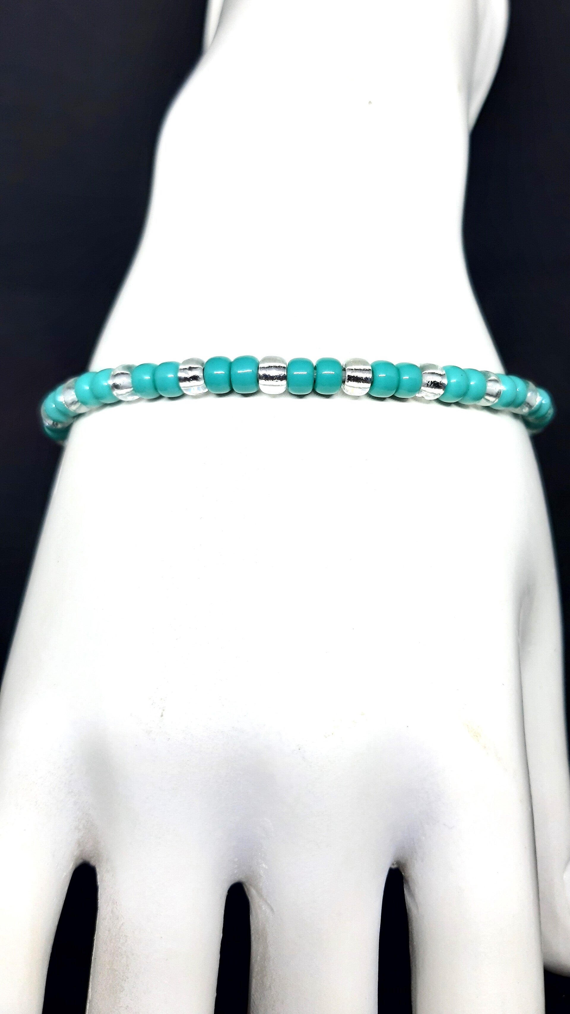 De armband en ring zijn vervaardigd uit Miyuki-kraaltjes in turquoise en zilverkleur.