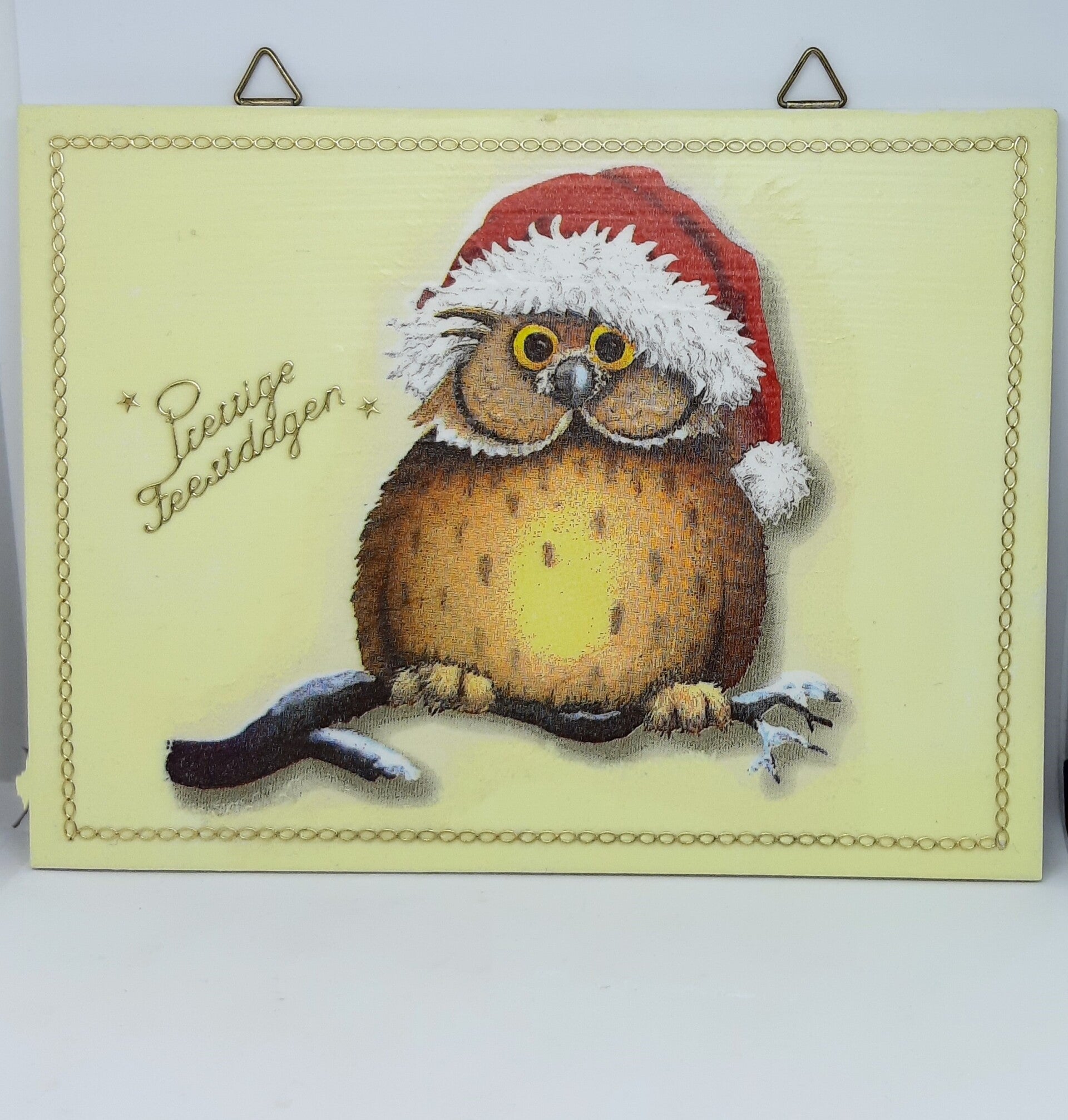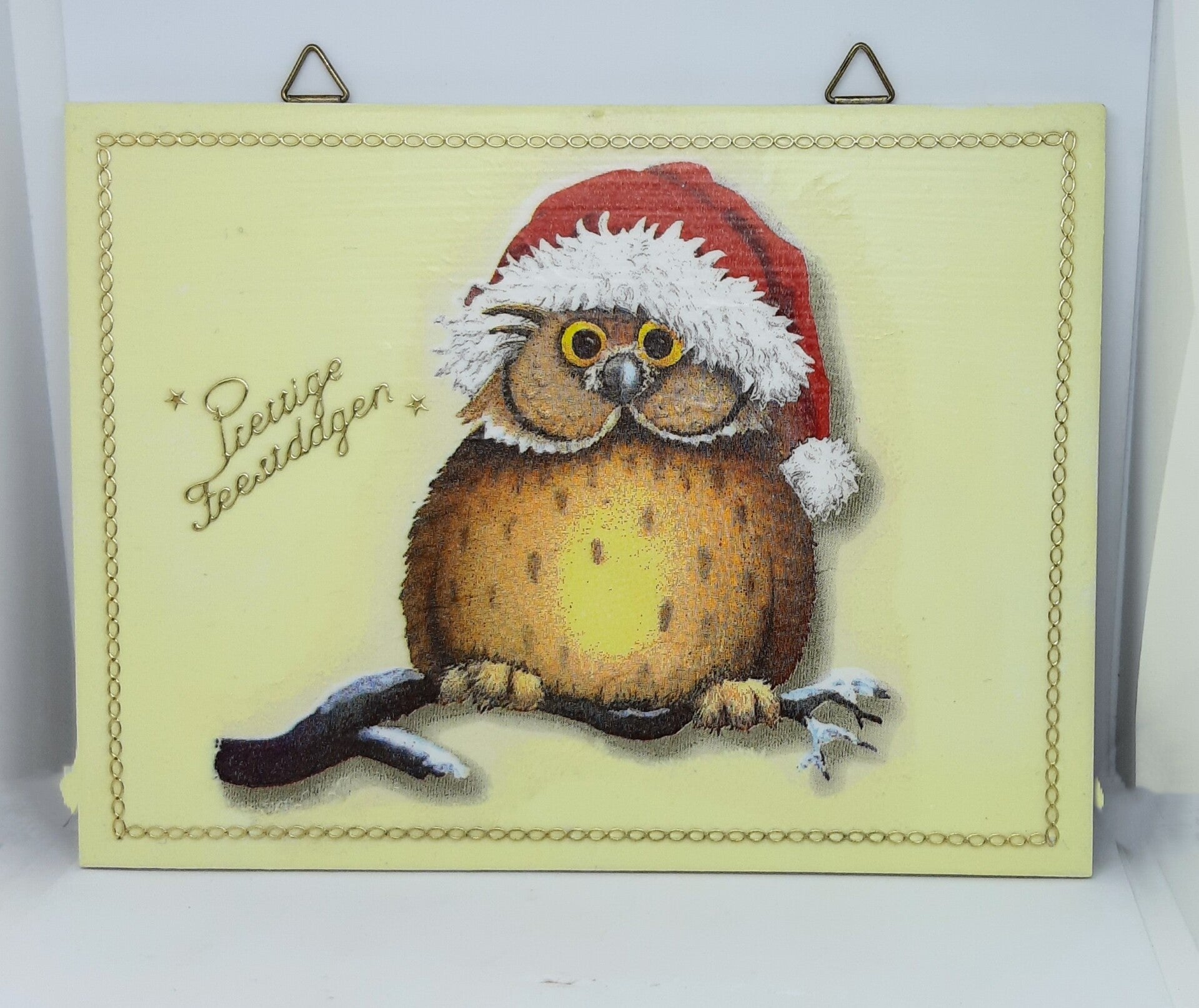 Dit kerstuiltje is gemaakt met de decoupage-techniek op leisteen. Het heeft twee ophanghaakjes en aan de achterkant vier transparante siliconen antikrasdopjes.