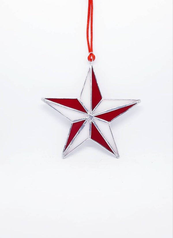 De 'Jasper' kerstster, vervaardigd in Tiffany-stijl met rood-witte kleuren, is voorzien van een satijnen koord om op te hangen. Het soldeerwerk is niet gepatineerd, waardoor het zijn zilveren kleur behoudt. De ster heeft een afmeting van 10 cm en wordt geleverd met een lint van 7 cm lang. Een charmant item dat zeker geschikt is als kerstgeschenk, gepresenteerd in een feestelijke verpakking.