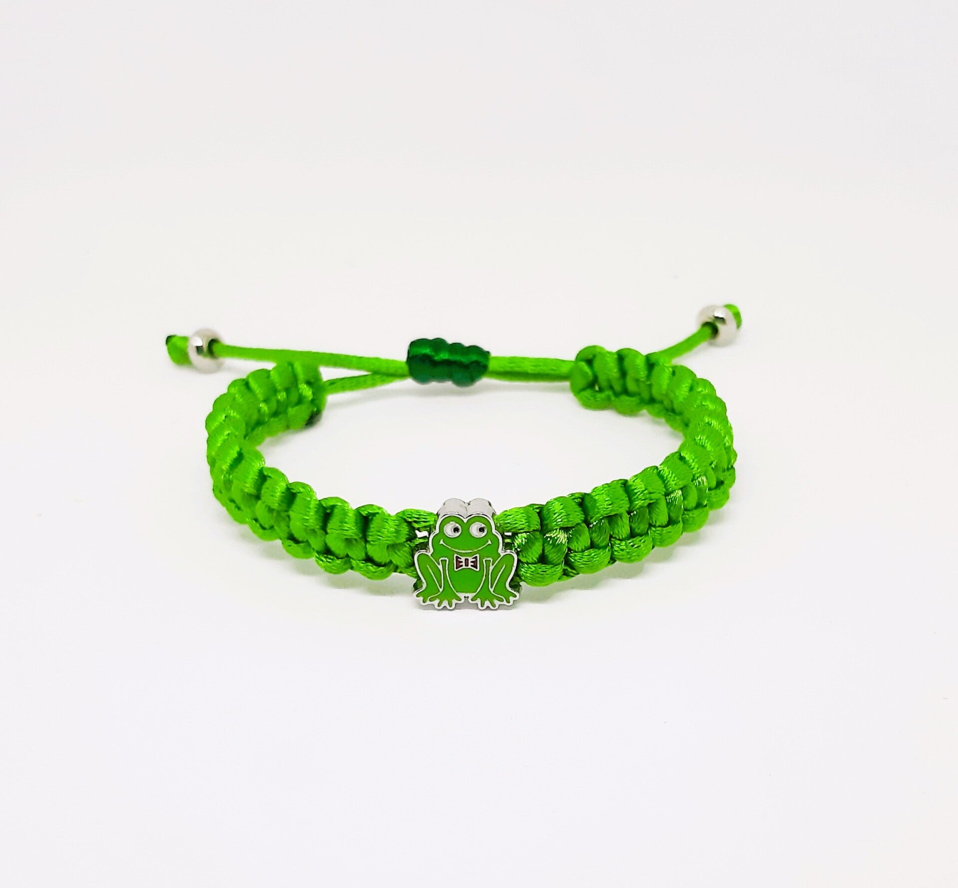 Een kleine metalen groene kikker, verweven met een groen satijnkoord voorzien van een schuifknoop. Aan het uiteinde bevindt zich een glanzende zilverkleurige kraal.