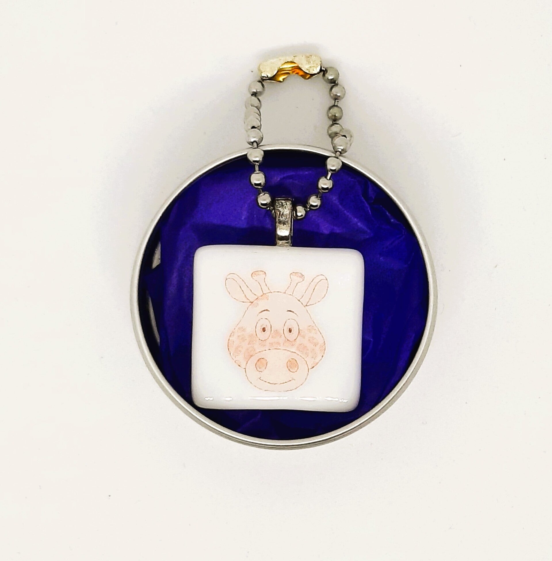 Een grappige giraffe versmolten in glas, omgetoverd tot een sleutelhanger. Afmetingen: 2,3 x 2,3 cm. Inclusief een ballchain ketting en een geschenkblikje.