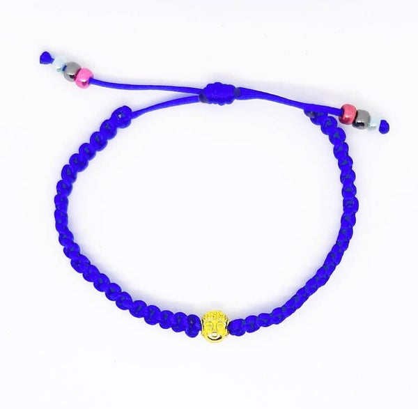 Een prachtig gevlochten satijnkoord in koningsblauw met een goudkleurig Boeddha-hoofd als tussenstuk. Dit armbandje is verfijnd afgewerkt met een verstelbare schuifknoop en metallic gekleurde Miyuki-kraaltjes van glas.
