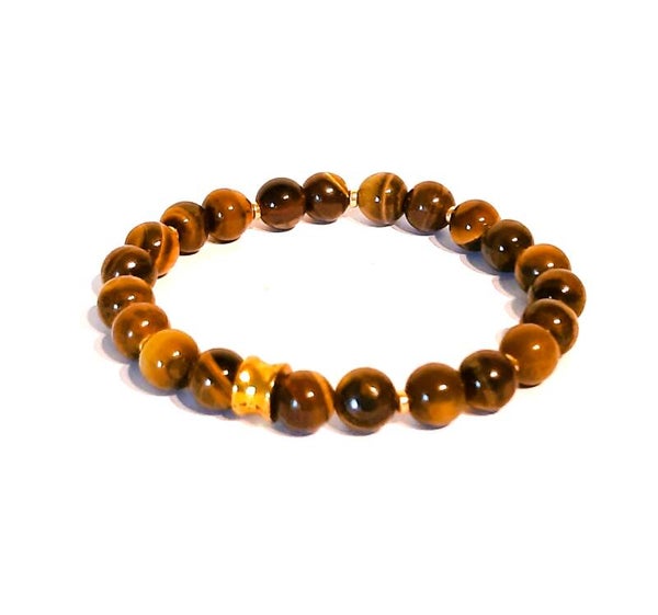 Prachtige Tijgeroog kralen van 8mm in diverse bruine tinten. Tussen de kralen bevinden zich 3mm Miyuki spacers in gegalvaniseerd goud. De knoopverberger bestaat uit een diabolovormige kraal in antiek goud.