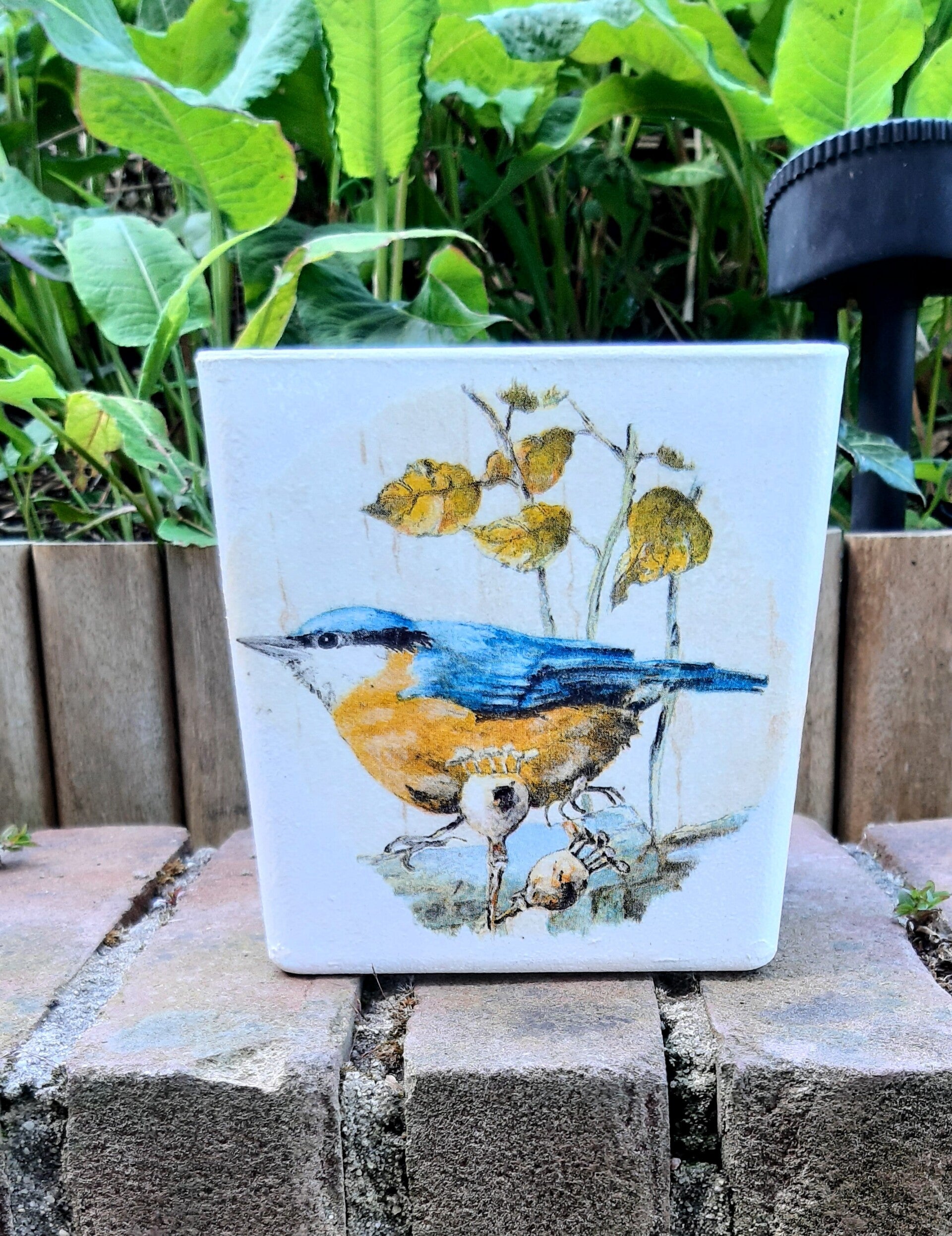 Dit vierkante glazen windlicht, uitgevoerd in decoupagestijl met vogelmotieven, bevat vier afbeeldingen waarvan twee identiek zijn.