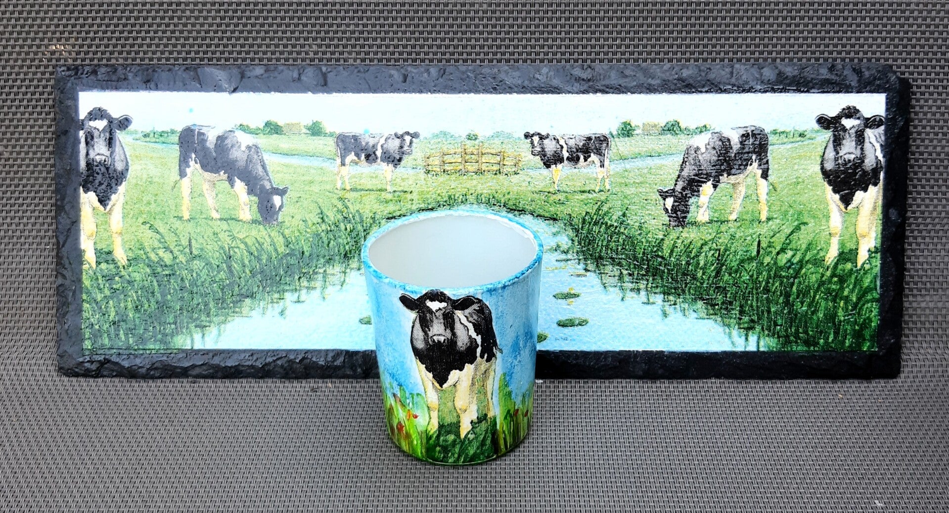 De bijpassende waxinelichthouder, gemaakt in dezelfde stijl met servet en verf, maakt het een uniek en aantrekkelijk setje, klaar voor gebruik.