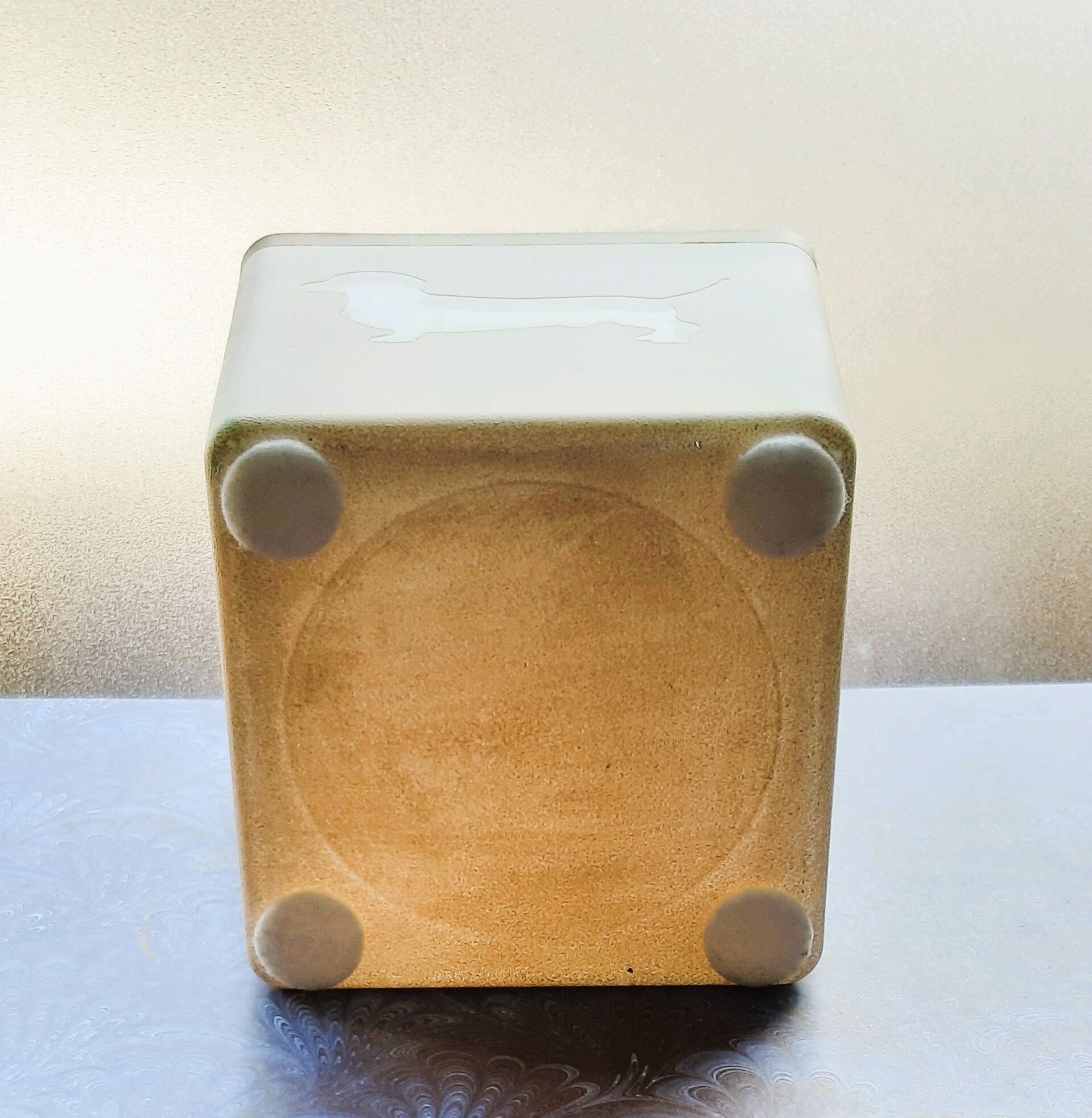 Het glazen windlicht (12x12 cm) is voorzien van de silhouetten van drie verschillende teckels en een set hondenpootjes.