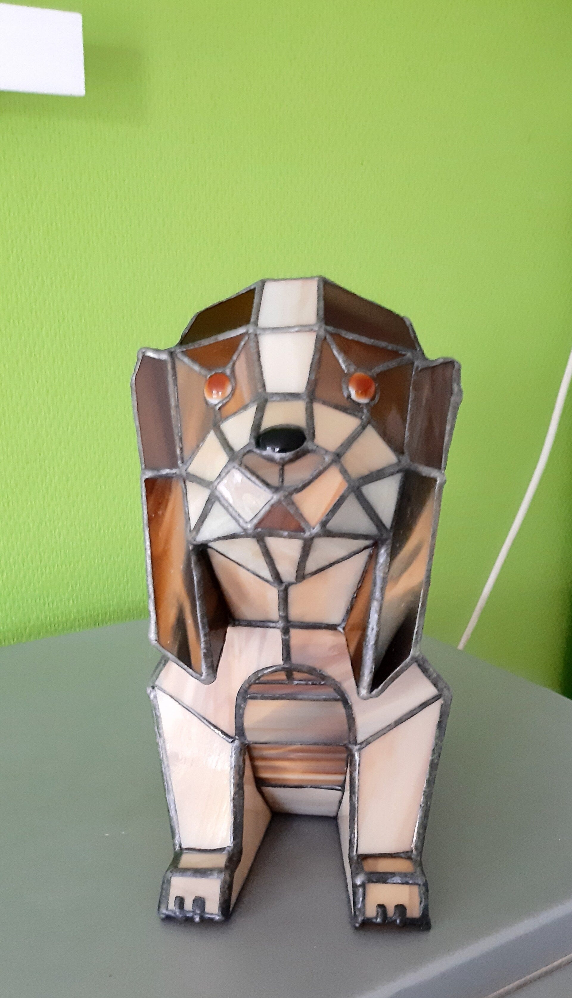 Dit prachtige Tiffany glas-in-lood hondje is wederom een uniek exemplaar uit ons glasatelier. Met zorg zijn de kleuren van het glas gekozen en samengevoegd in een geometrisch patroon met gesoldeerde en zwart gepatineerde verbindingen. De lamp is voorzien van een schakelaar en een E14 ledlamp van 310 lumen (29W), die de glaskleuren mooi laat schitteren.