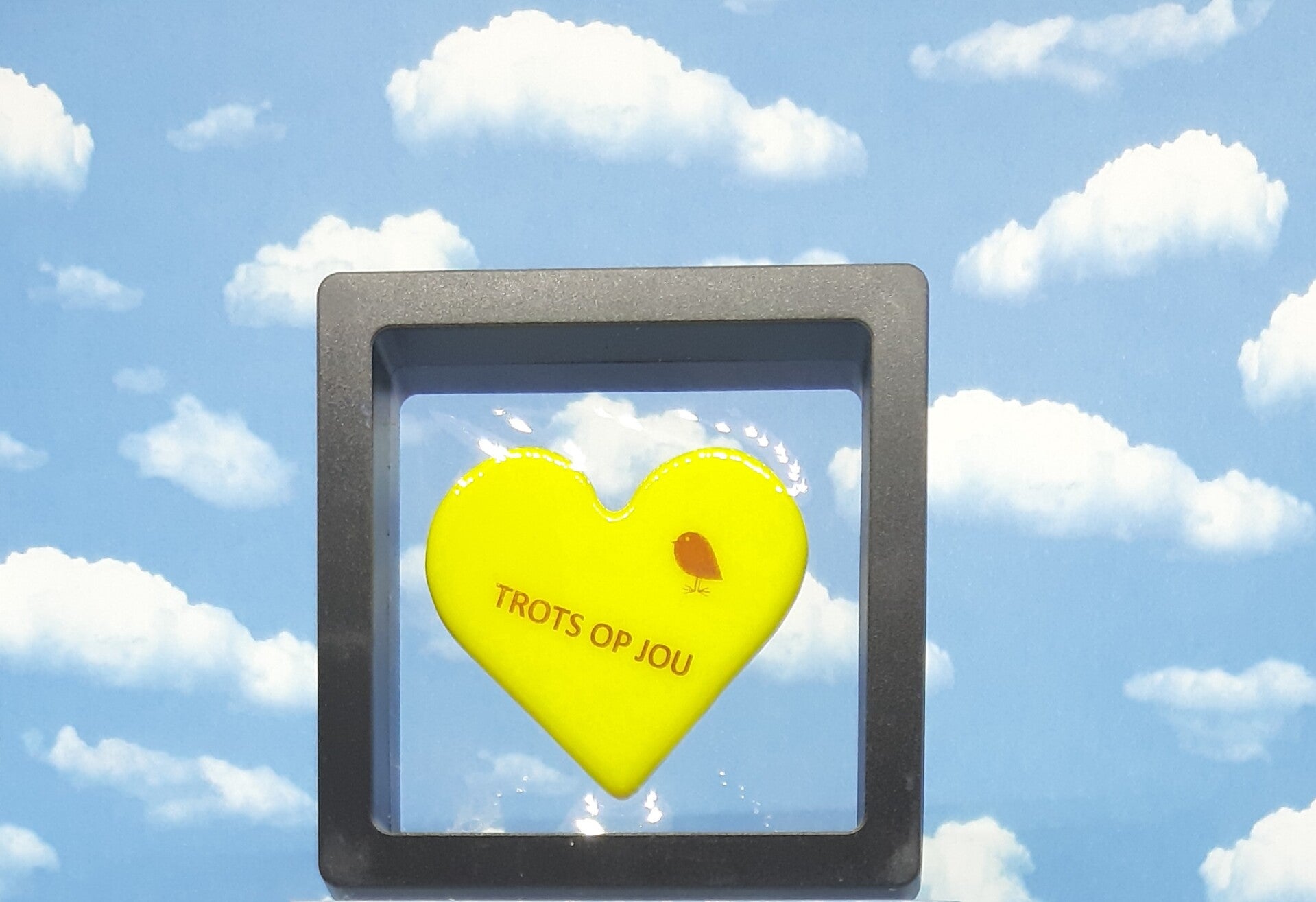 Dit hartje is slechts 3mm dik, gemaakt d.mv. glasfusing wordt gepresenteerd in een doosje van 7x7cm. De transparante laag geeft de illusie dat het hartje zweeft, ideaal voor op een tafel of dressoir.