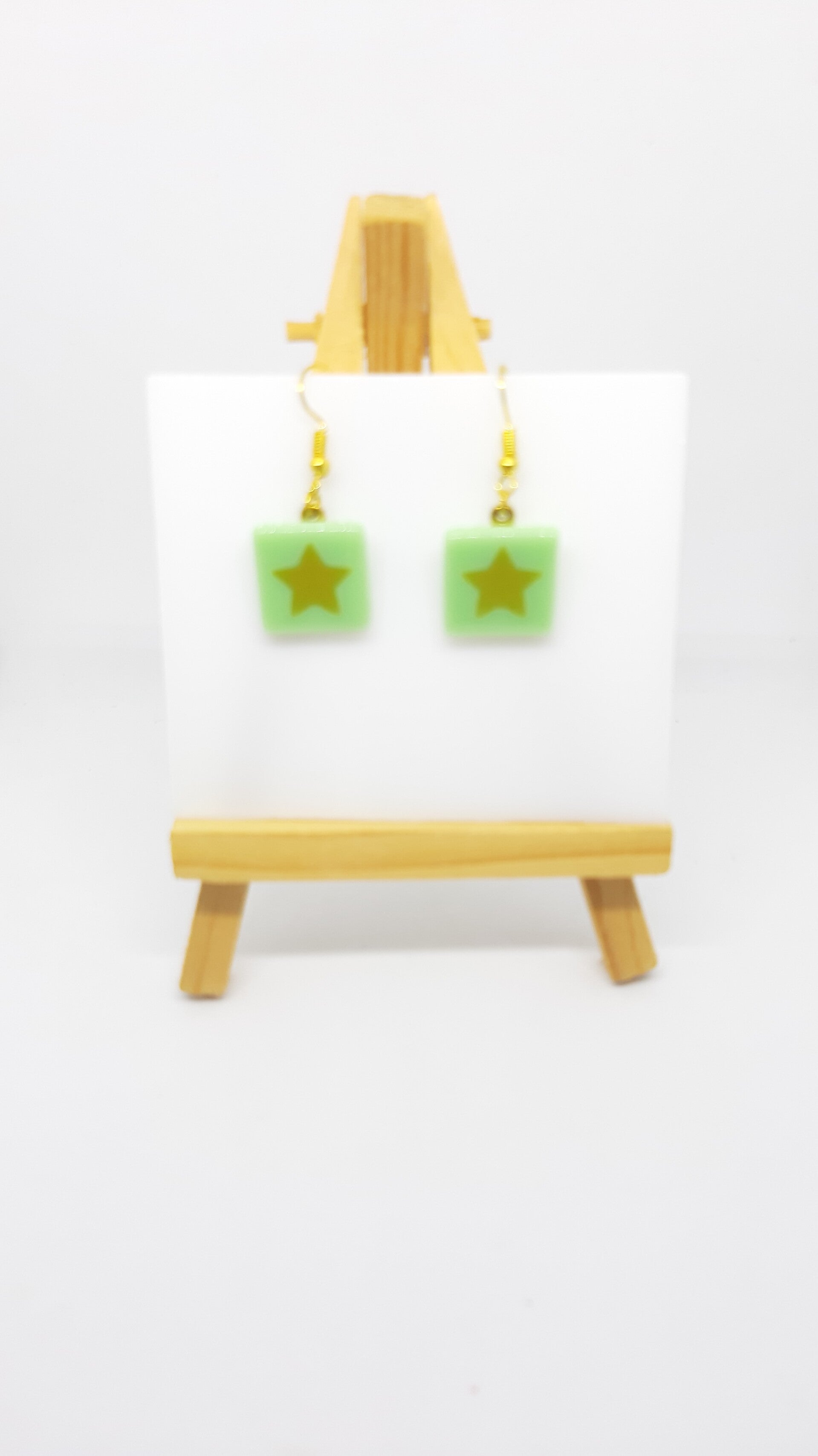 Zachte groene glazen oorbellen met in het glas versmolten goudkleurige sterren. Het glas is slechts 3 mm dik en voorzien van een goudkleurige bail en oorhaakjes. Transparante kunststof stoppertjes worden uiteraard meegeleverd.