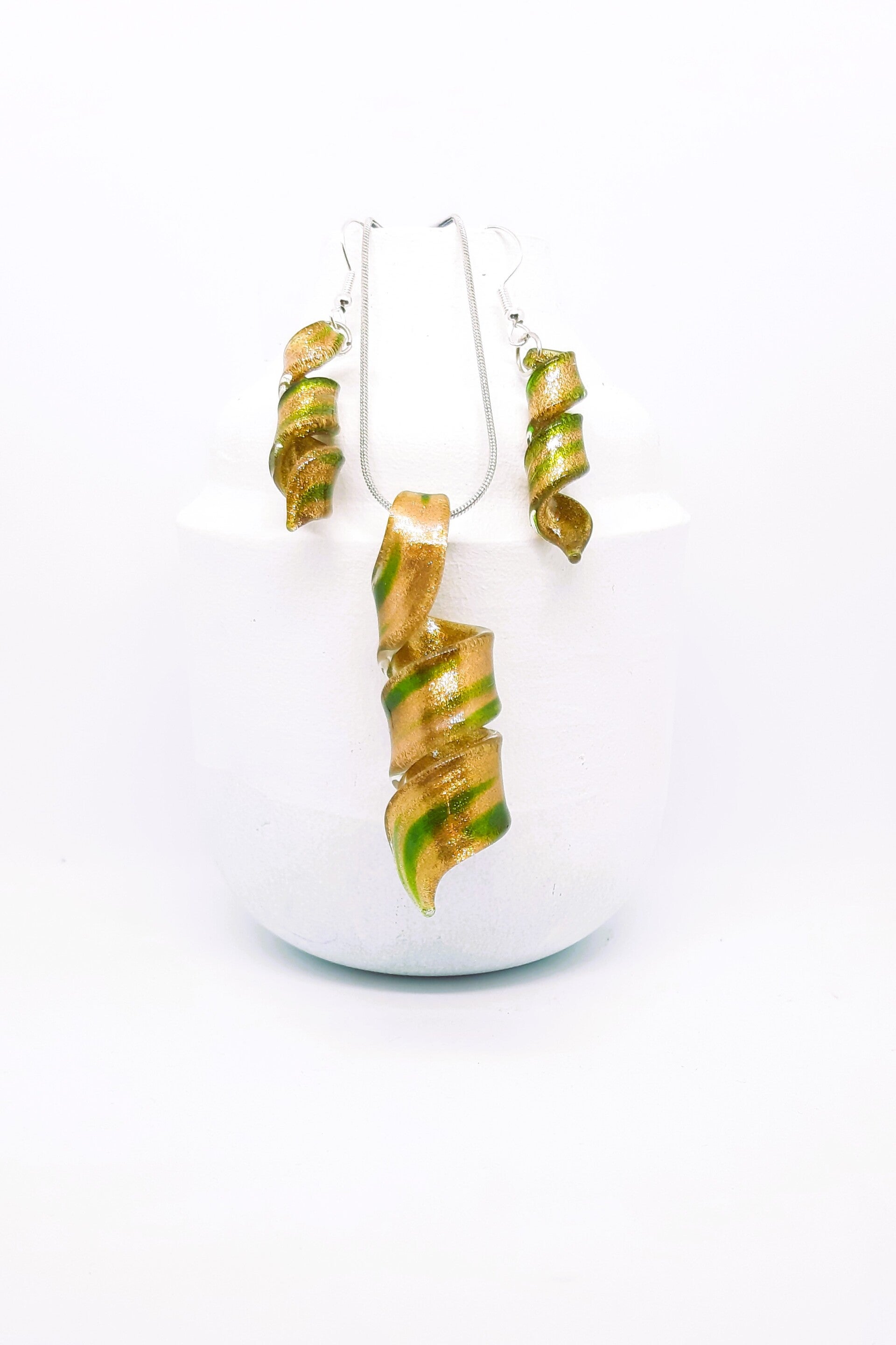 Een zilverkleurige snakeketting met een prachtig gedraaide Murano glashanger en bijpassende oorhangers is beschikbaar.