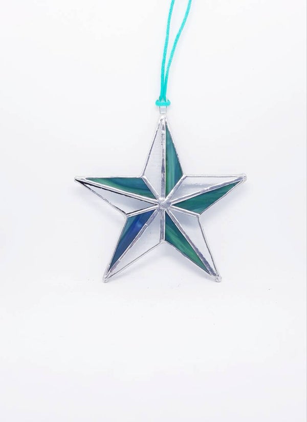 De 'Orion' kerstster, gemaakt in de Tiffany-stijl met groen-blauw gemarmerd en helder glas, is uitgerust met een satijnen ophangkoord. Het soldeerwerk is ongepatineerd gelaten, waardoor het zijn zilverkleurige glans behoudt. Met een afmeting van 10 cm en een lint van 7 cm, vormt deze ster een betoverend kerstcadeau, compleet met een feestelijke verpakking.