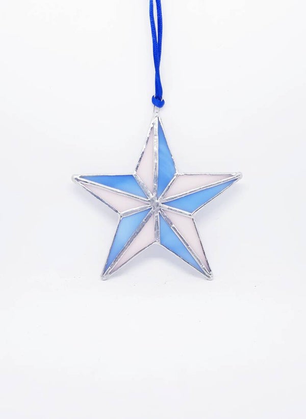 De kerstster 'Sarah', gemaakt in Tiffany-stijl met lichtblauw glas en aan één zijde iriserend glas, verandert van kleur bij verschillende lichtinval. De ster heeft een satijnen koord voor ophanging en het soldeer is niet gepatineerd, wat de zilveren look behoudt. Met een afmeting van 10 cm en een lint van 7 cm, is dit een charmant item om als kerstcadeau te geven, inclusief een feestelijke verpakking.
