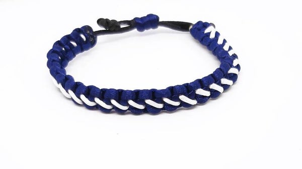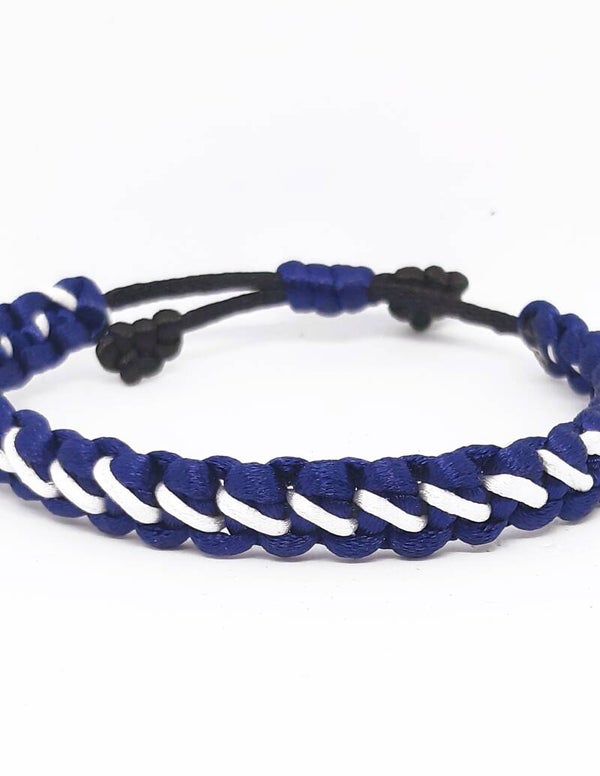 Donkerblauw/wit van satijnkoord gevlochten armband. Deze heeft een schuifknoop, waardoor hij altijd past en super makkelijk om en af kan.