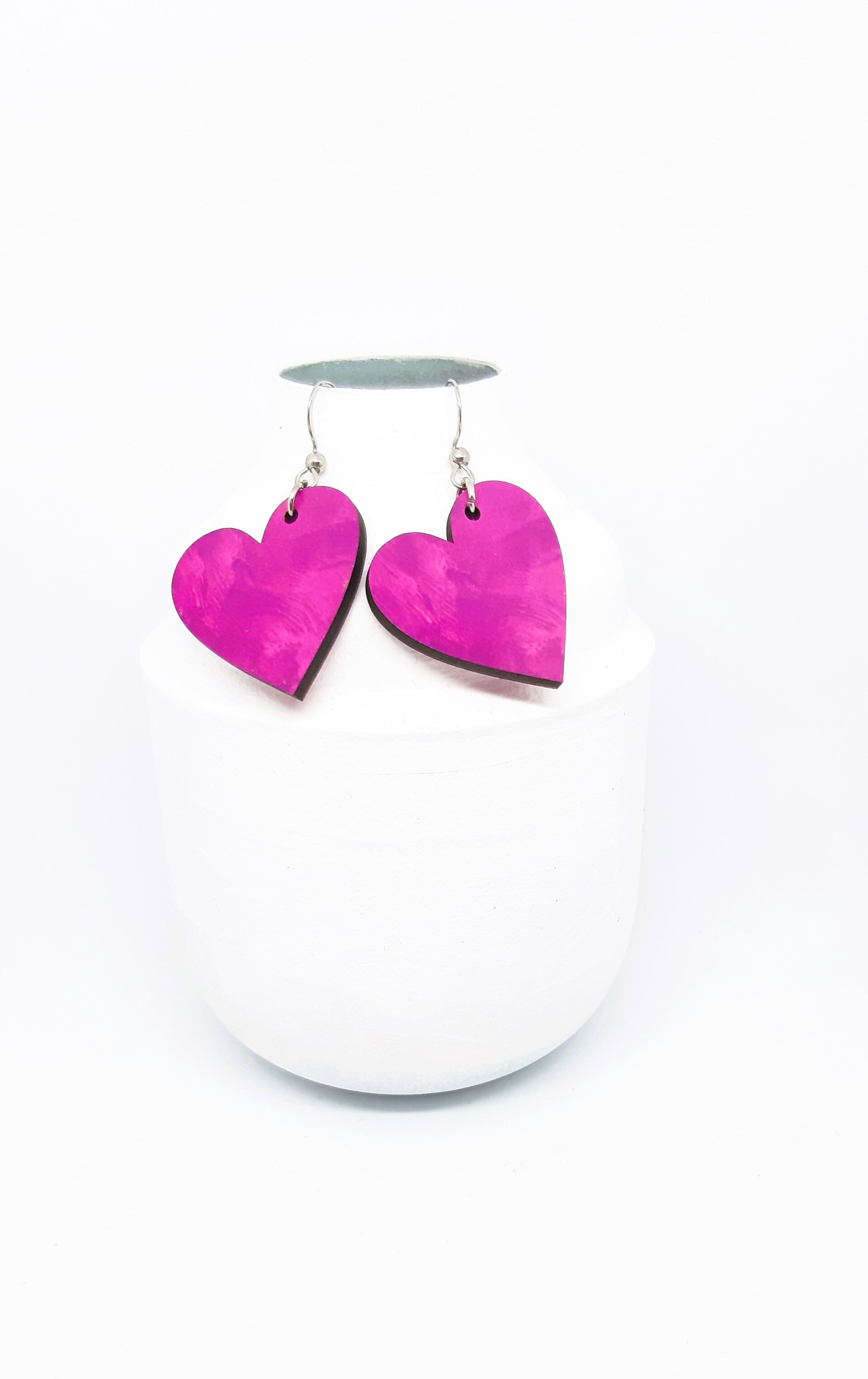 Opvallende roze oorbellen in de vorm van een hartje. De haakjes zijn van roestvrij staal en worden geleverd met transparante stoppers. Beide zijde zijn bedrukt.