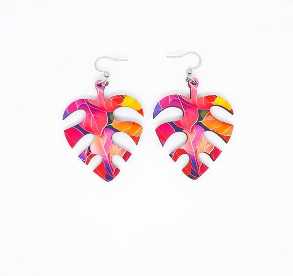 Oorbellen in de vorm van een plantenblad met lichte, vrolijke kleuren geeft je wel het vacantie gevoel.