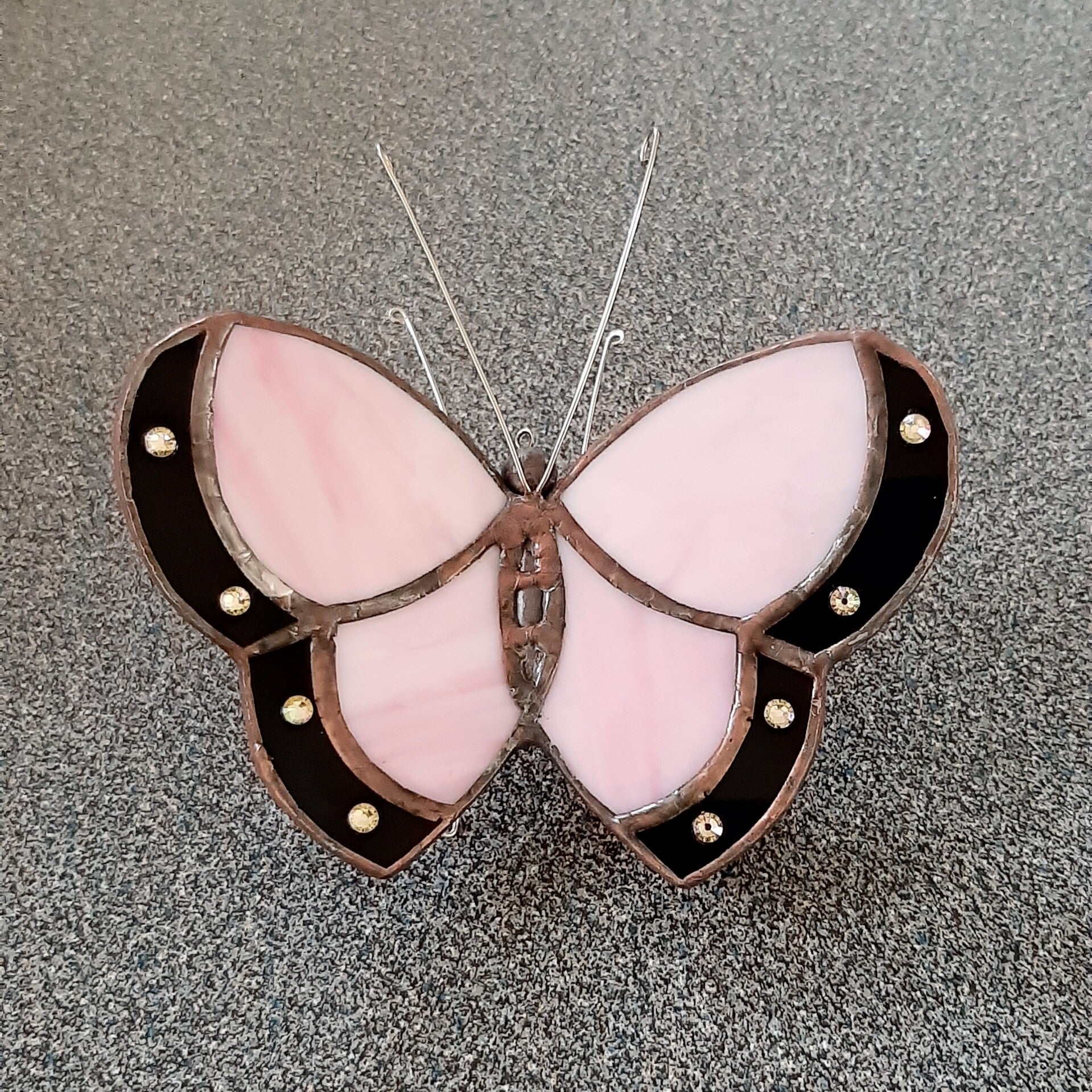Een roze glasvlinder met Swarovski steentjes kleur louminous green van 4mm. Het lijfje is handgemaakt en al het soldeerwerk is brons gepatineerd wat een mooie vintage uitstraling geeft. Met een klein oogje aan de kop van de vlinder kan deze eenvoudig worden opgehangen.