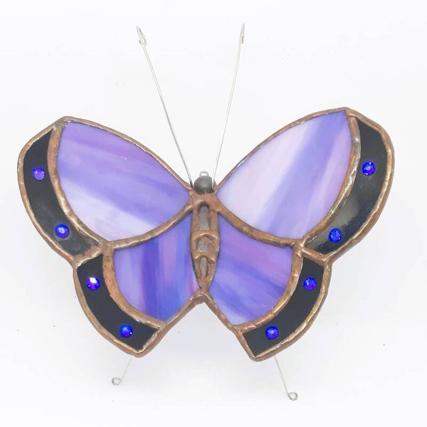 Een paarse glasvlinder met Swarovski steentjes kleur heliotrope van 4mm. Het lijfje is handgemaakt en al het soldeerwerk is brons gepatineerd wat een mooie vintage uitstraling geeft. Met een klein oogje aan de kop van de vlinder kan deze eenvoudig worden opgehangen.