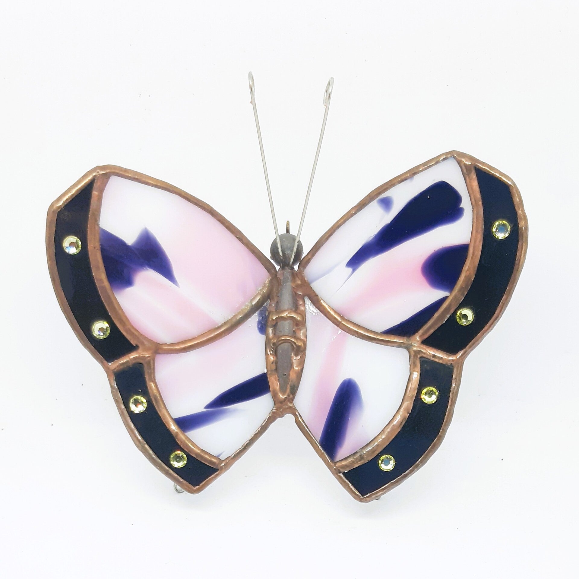 Een wit-zwart/paars en roze glasvlinder met Swarovski steentjes kleur heliotrope van 4mm. Het lijfje is handgemaakt en al het soldeerwerk is brons gepatineerd wat een mooie vintage uitstraling geeft. Met een klein oogje aan de kop van de vlinder kan deze eenvoudig worden opgehangen.