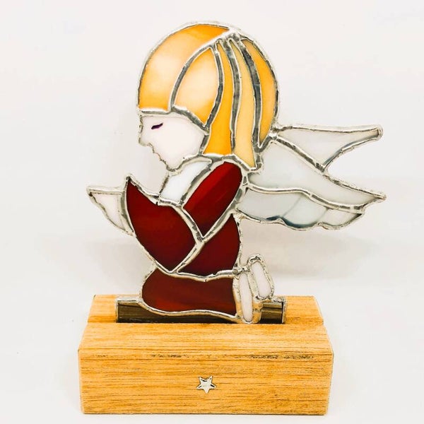 Tiffany engeltje Sara draagt rode kleding, heeft donkerblond haar en vleugels van misty white glas. Ze kan mooi neergezet worden in het houten blokje die voorzien is van een hartje aan een kant en aan de ander kant een sterretje.