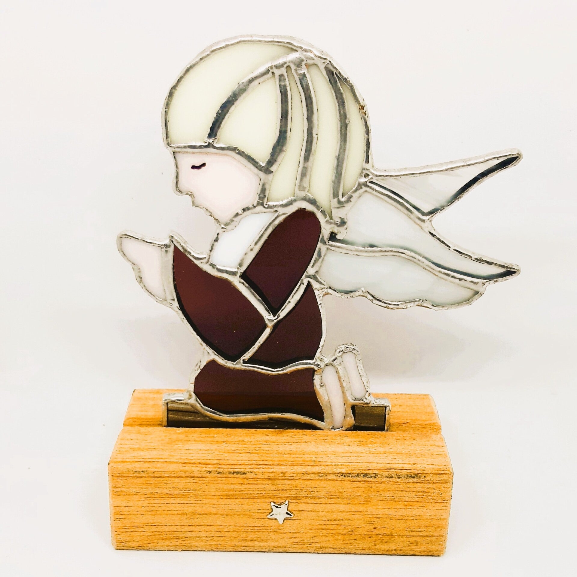 Tiffany engeltje Mara draagt karmijnkleurige kleding, heeft lichtblond haar en vleugels van misty white glas. Ze kan mooi neergezet worden in het houten blokje die voorzien is van een hartje aan een kant en aan de ander kant een sterretje.