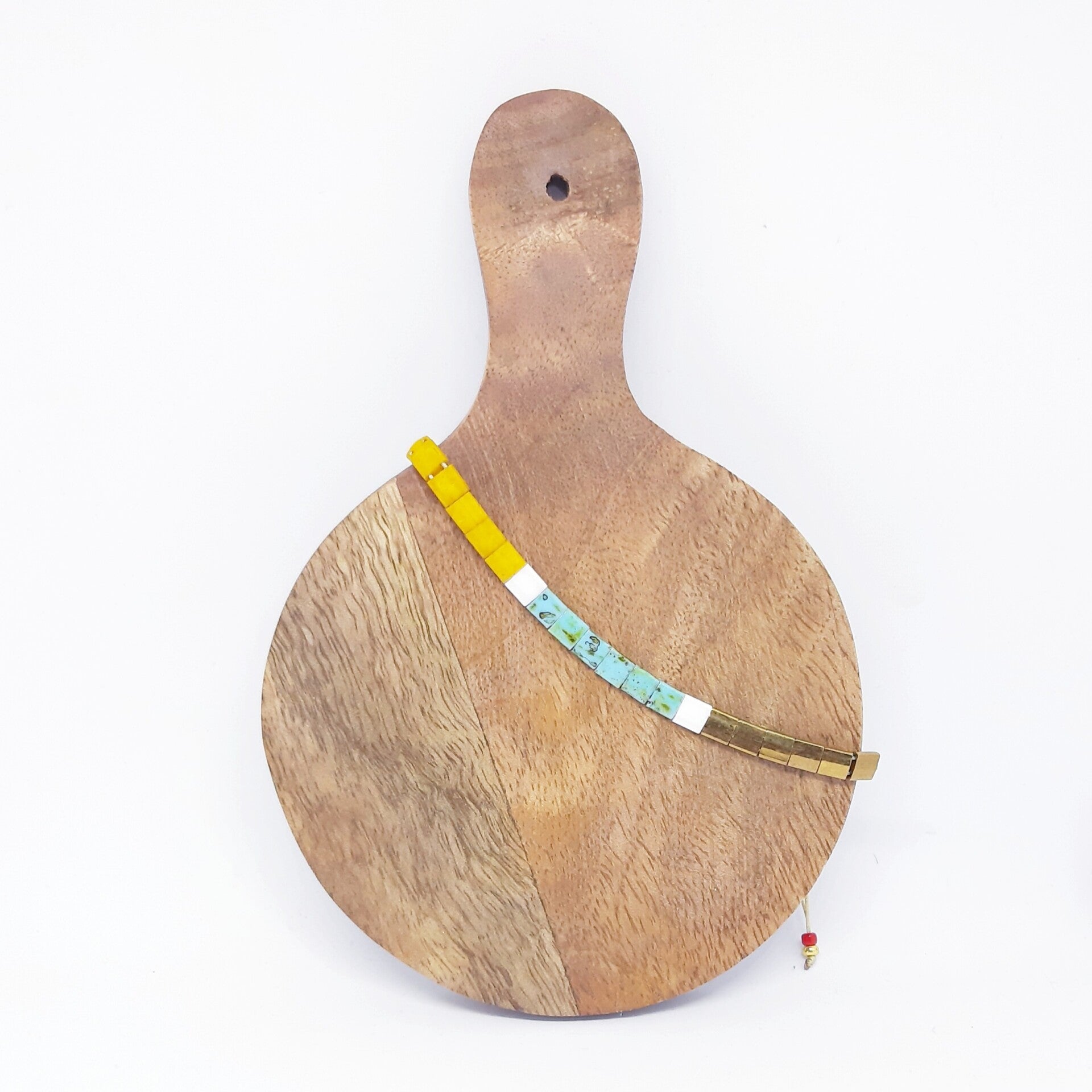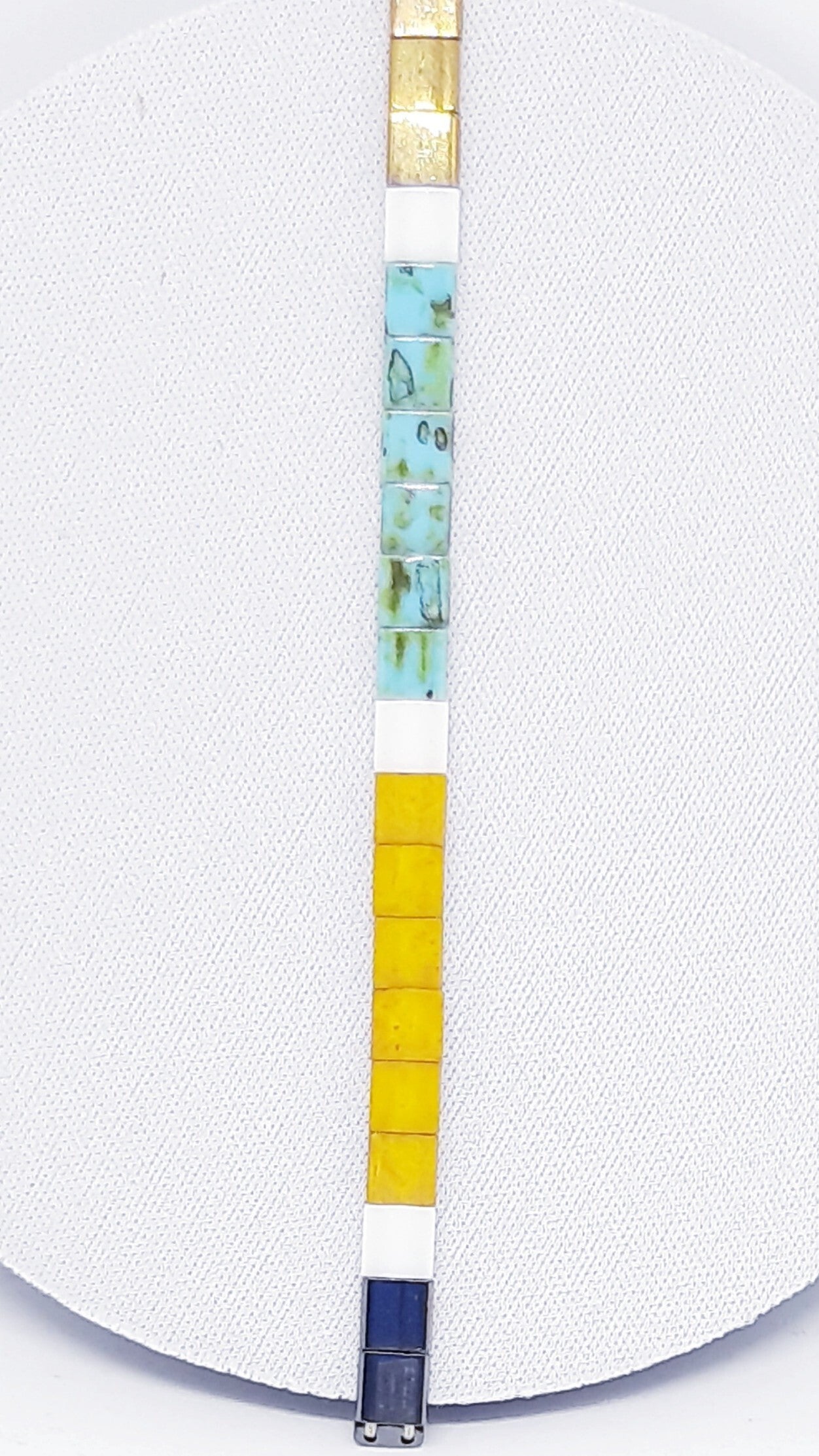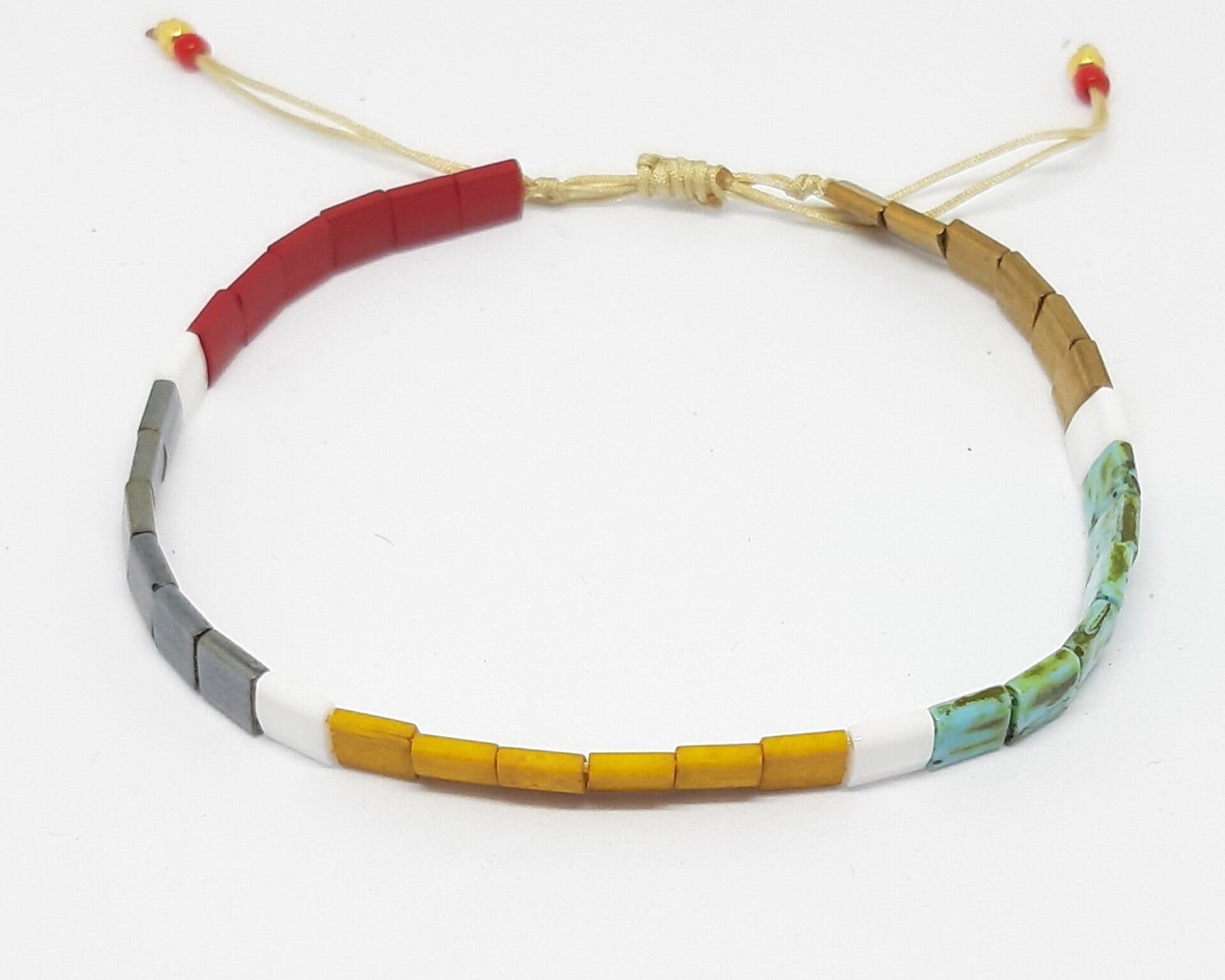 Rood, metallic, wit, brons, mosterd en picasso zijn de kleuren die geregen zijn op dun beige draad, wat de armband een elegante en luxe uitstraling geeft. Dankzij de schuifknop is dit sieraad altijd perfect passend.