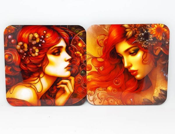 Zeer kleurrijk setje van 2 met hoogglans afbeeldingen van vrouwen van kunstenaar Alfons Mucha.