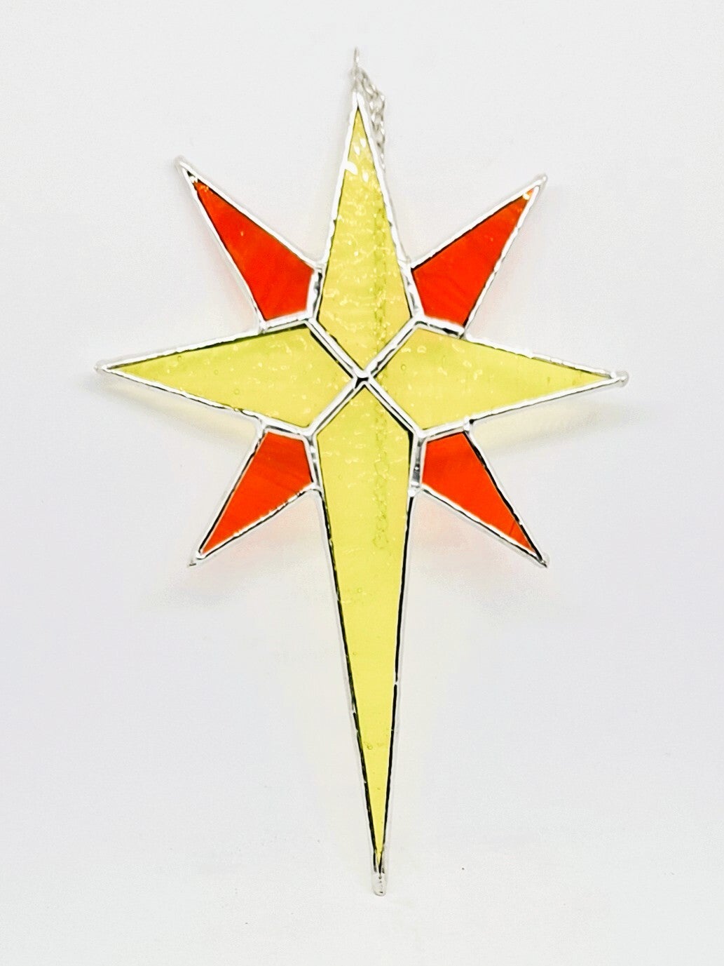 Mooi doorzichtig geel glas met structuur en heldere kleine oranje punten. Het ophangkettingtje is 11 cm lang.