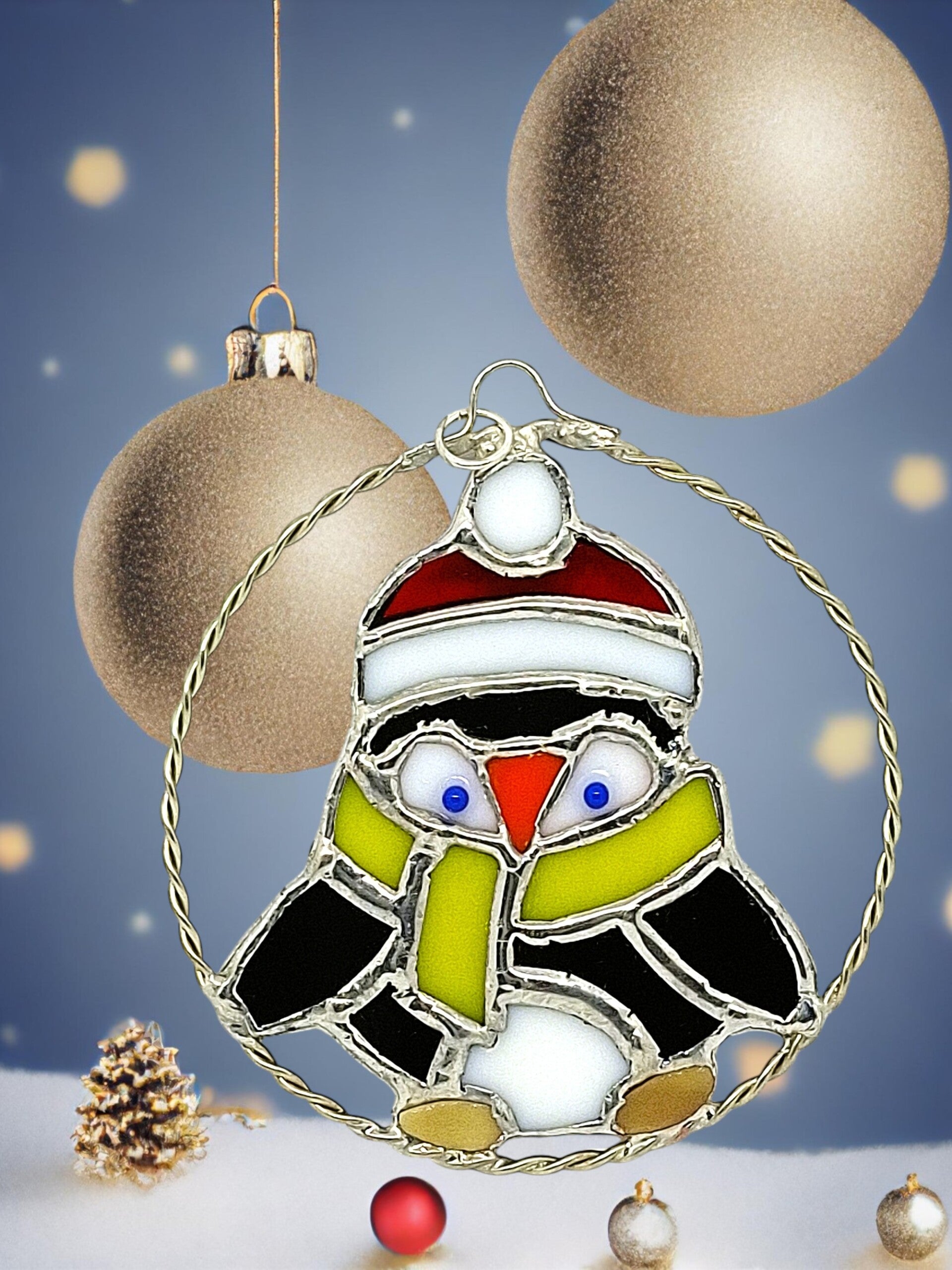 Dit kleine pinguïnfiguurtje met blauwe oogjes is gemaakt in Tiffany-stijl, waarbij het soldeer zilverkleurig is gelaten om het kerstgevoel te versterken. Hij is 7 cm groot en voorzien van een oogje, zodat er bijvoorbeeld een mooi lintje doorheen gehaald kan worden.