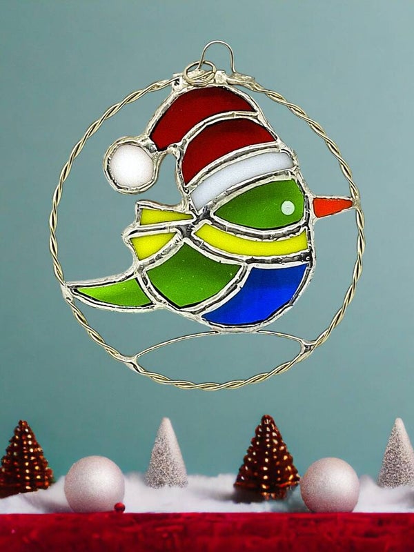 Dit kerstvogeltje heeft witte glazen kraaloogjes en draagt een geel sjaaltje om warm te blijven. Het soldeerwerk is zilverkleurig gelaten voor een feestelijke uitstraling. Afmeting: 7 cm.