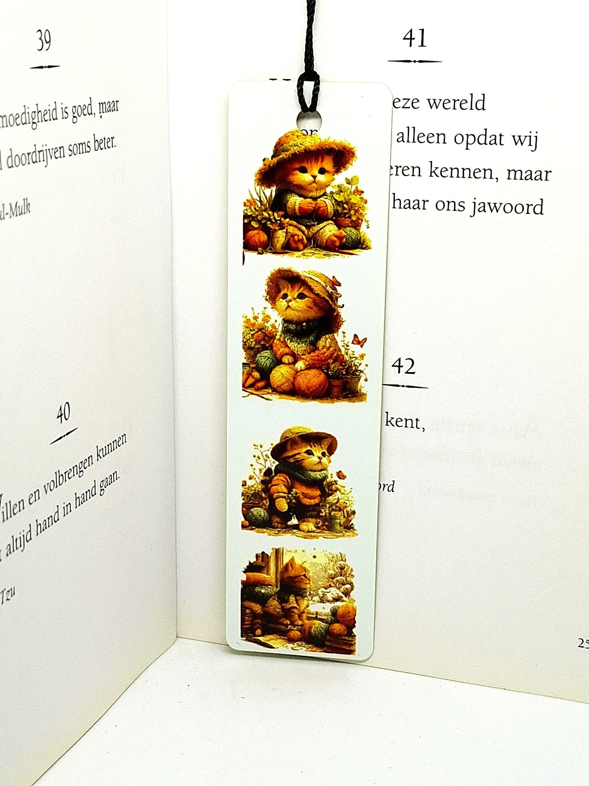 Deze lichte aluminium boekenlegger is voorzien van een sublimatieprint met drie schattige katjes, een tekst op de andere zijde en een zwart kwastje dat het geheel compleet maakt.