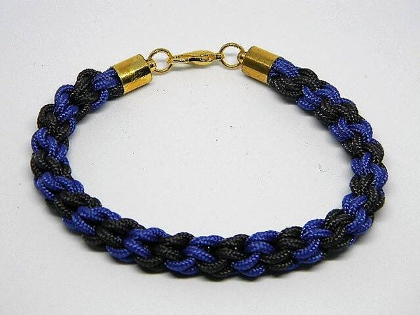 Een zeer stoere armband, gevlochten in de Kumihimo-stijl met parakoord. De kleuren zijn donkerblauw en diepgrijs, afgewerkt met goudkleurige eindkapjes en een karabijnsluiting.