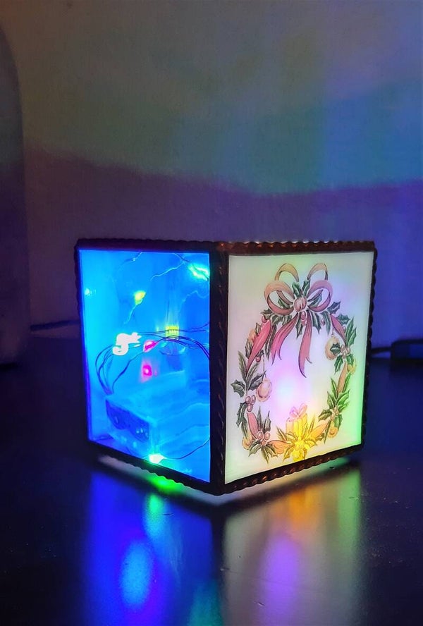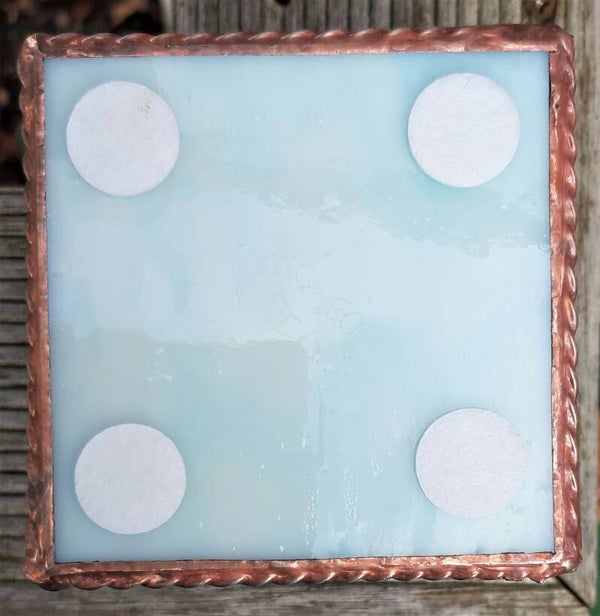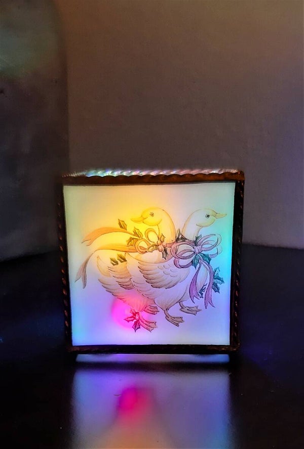 Een feestelijke waxinelichthouder in de stijl van Tiffany, gemaakt met koperfolie, toont prachtig transparant blauw glas aan elke kant en twee kerstafbeeldingen die in het glas zijn versmolten. De onderkant is voorzien van viltjes tegen krassen.