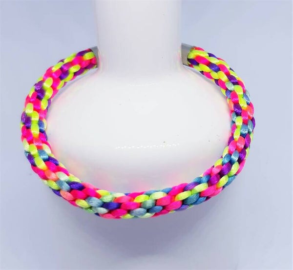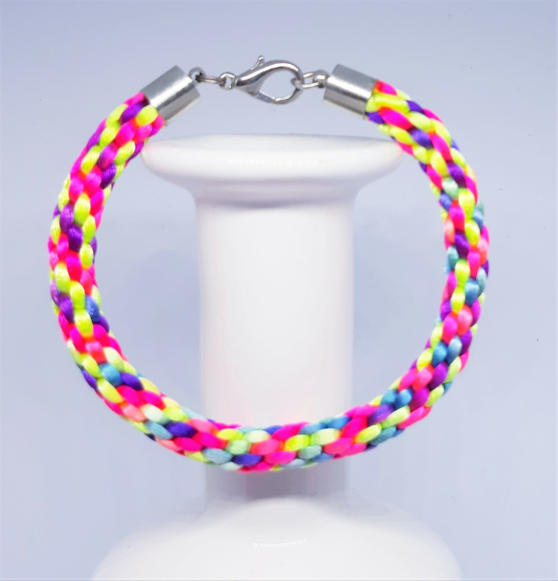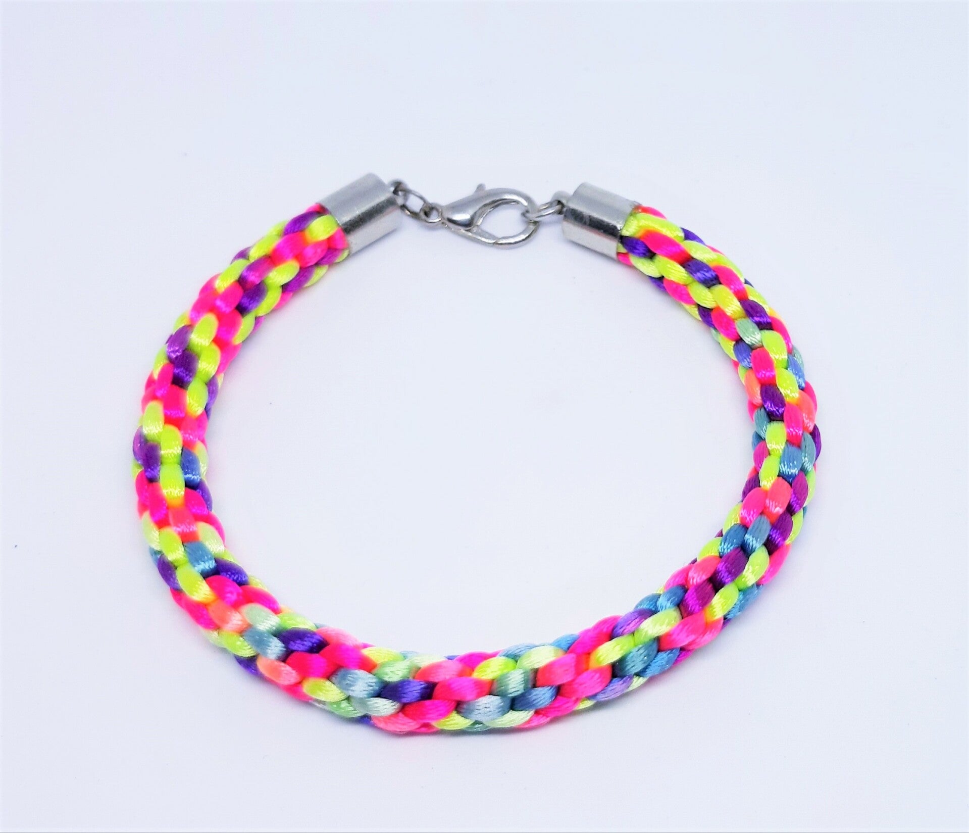 Een vrolijk gekleurde, met kumihimo-techniek gevlochten armband van satijnkoord, voorzien van zilverkleurige eindkapjes en een karabijnsluiting.