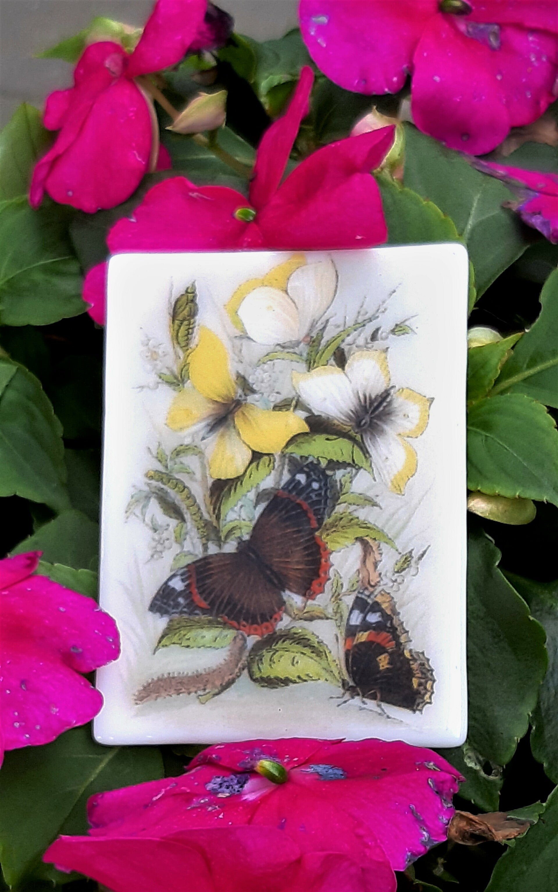 XXL-magneet van wit glas met een prachtige voorstelling van bloemen en vlinders. Aan de achterzijde zijn twee krachtige magneten aangebracht. Afmetingen: 5 cm breed en 7 cm hoog.