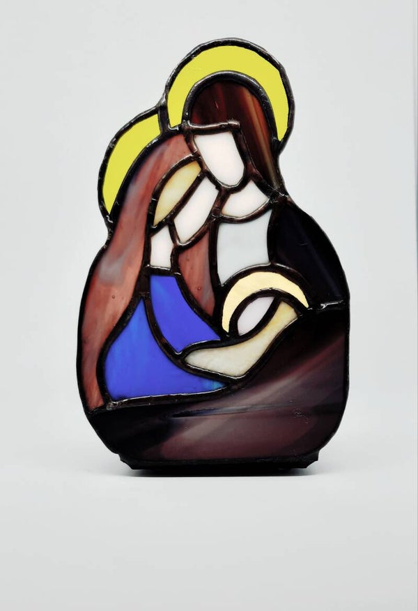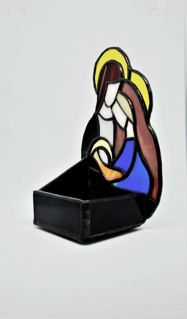 Afgebeeld zijn Maria, Jozef en het kindje Jezus, met zwart gepatineerd soldeerwerk.
