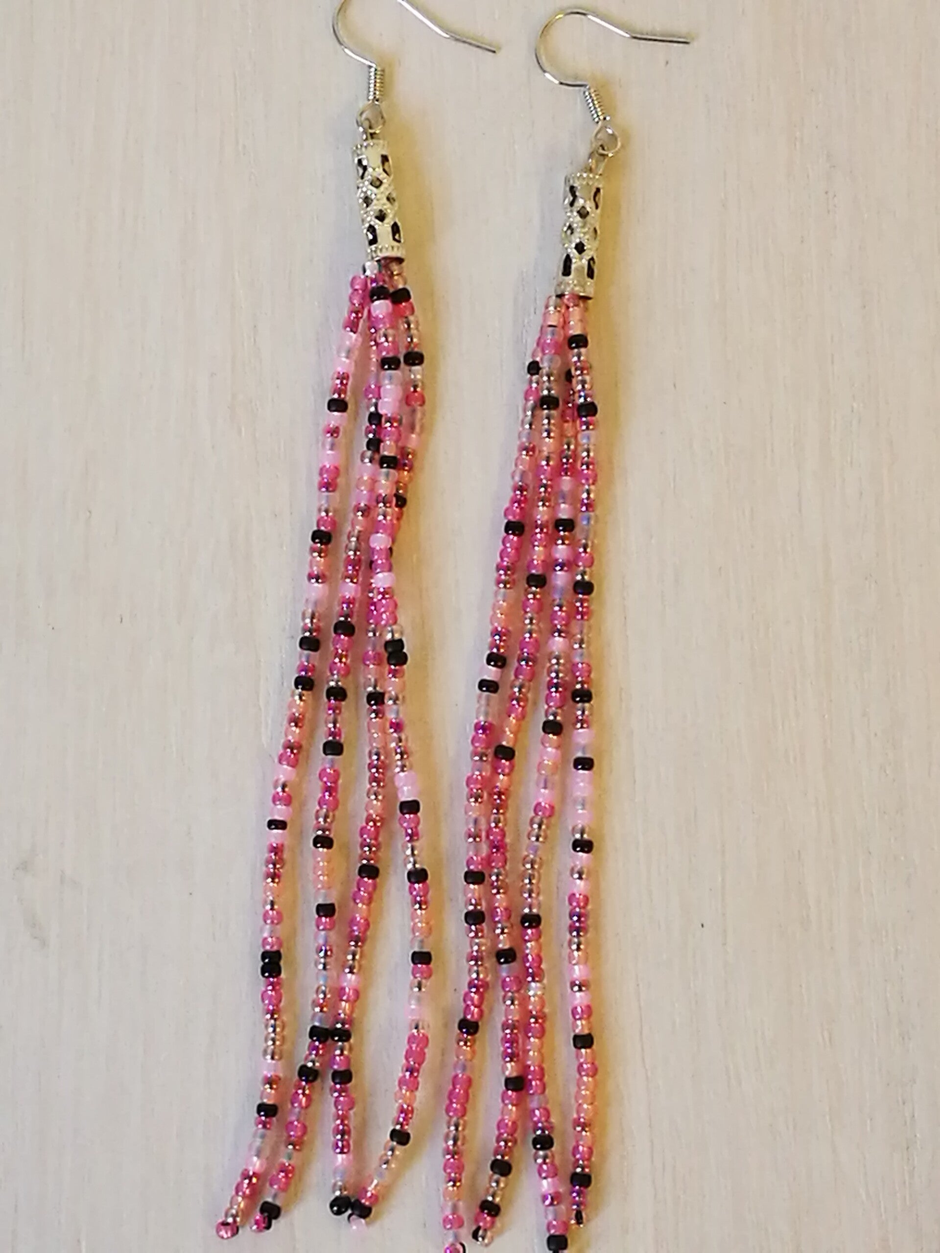 Een prachtige set oorhangers vervaardigd met glazen Miyuki-kraaltjes, maat 11/0, in harmonieus op elkaar afgestemde kleuren. De totale lengte bedraagt 12,5 cm.