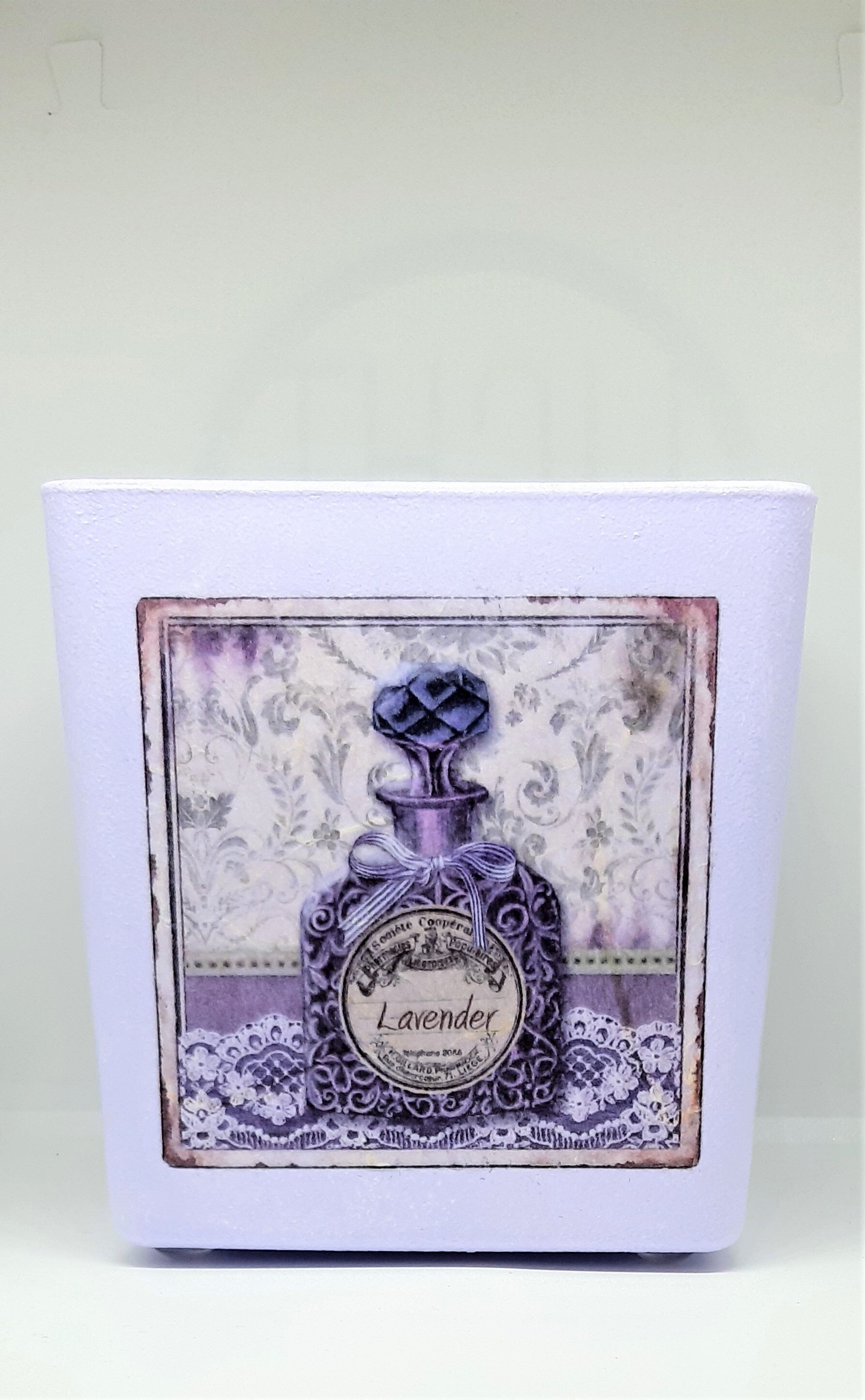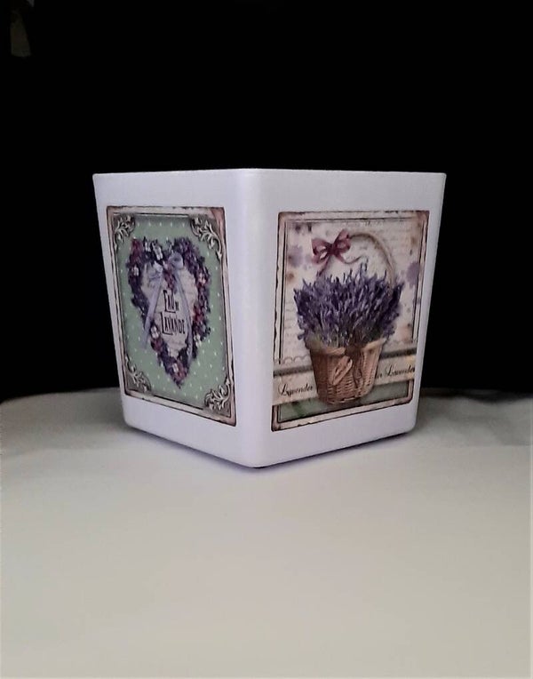 Een vierkante glazen accubak van 11,5 bij 11,5 cm, gedecoreerd met de decoupage-techniek. De lichtlila achtergrond gaat prachtig samen met de paarse lavendel. De bak weegt 1 kilo en heeft transparante antikrasbeschermers aan de onderzijde.