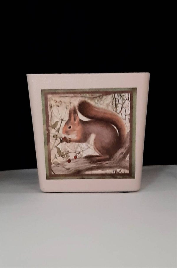 Een vierkante glazen accubak van 11,5 x 11,5 cm, versierd met de decoupage-techniek, is beschikbaar.